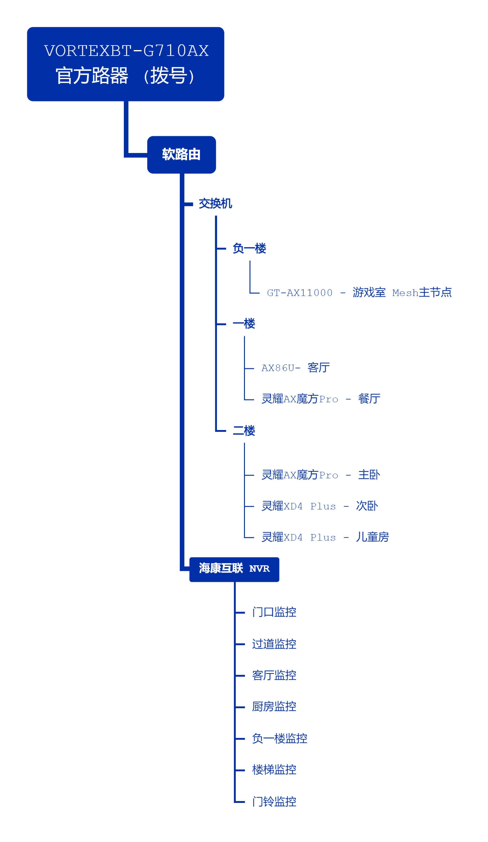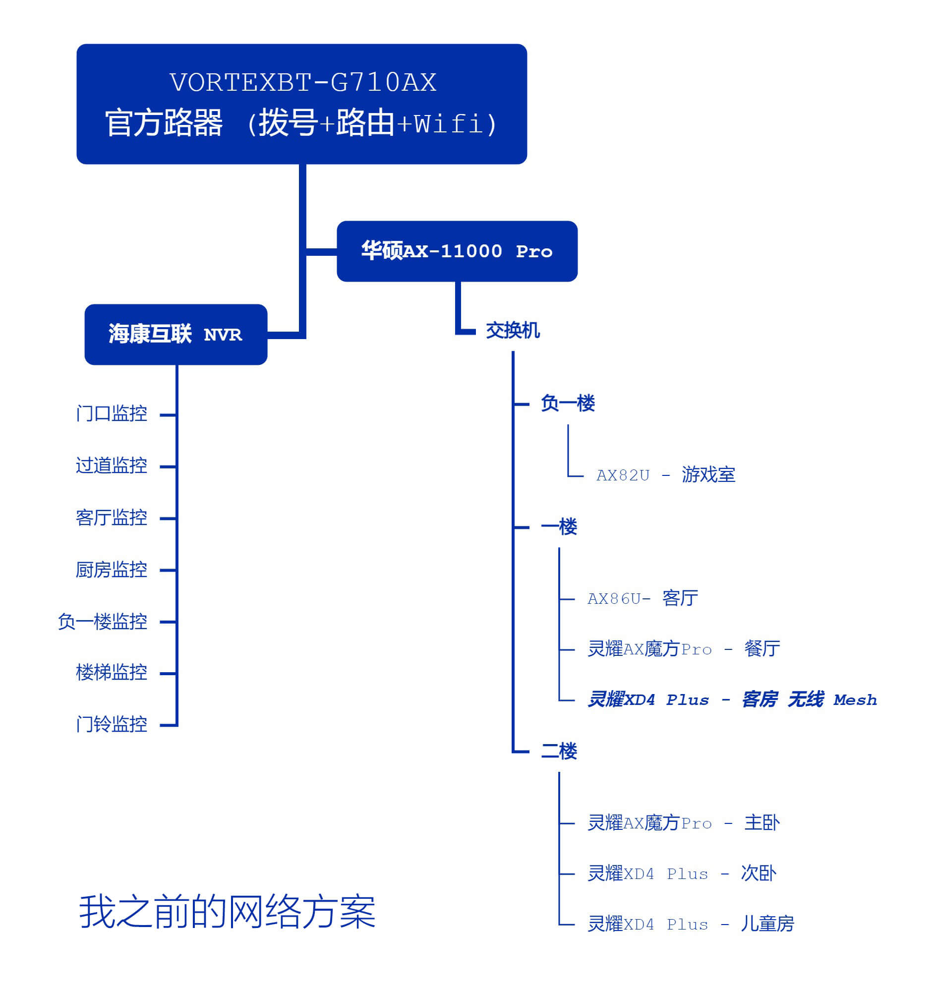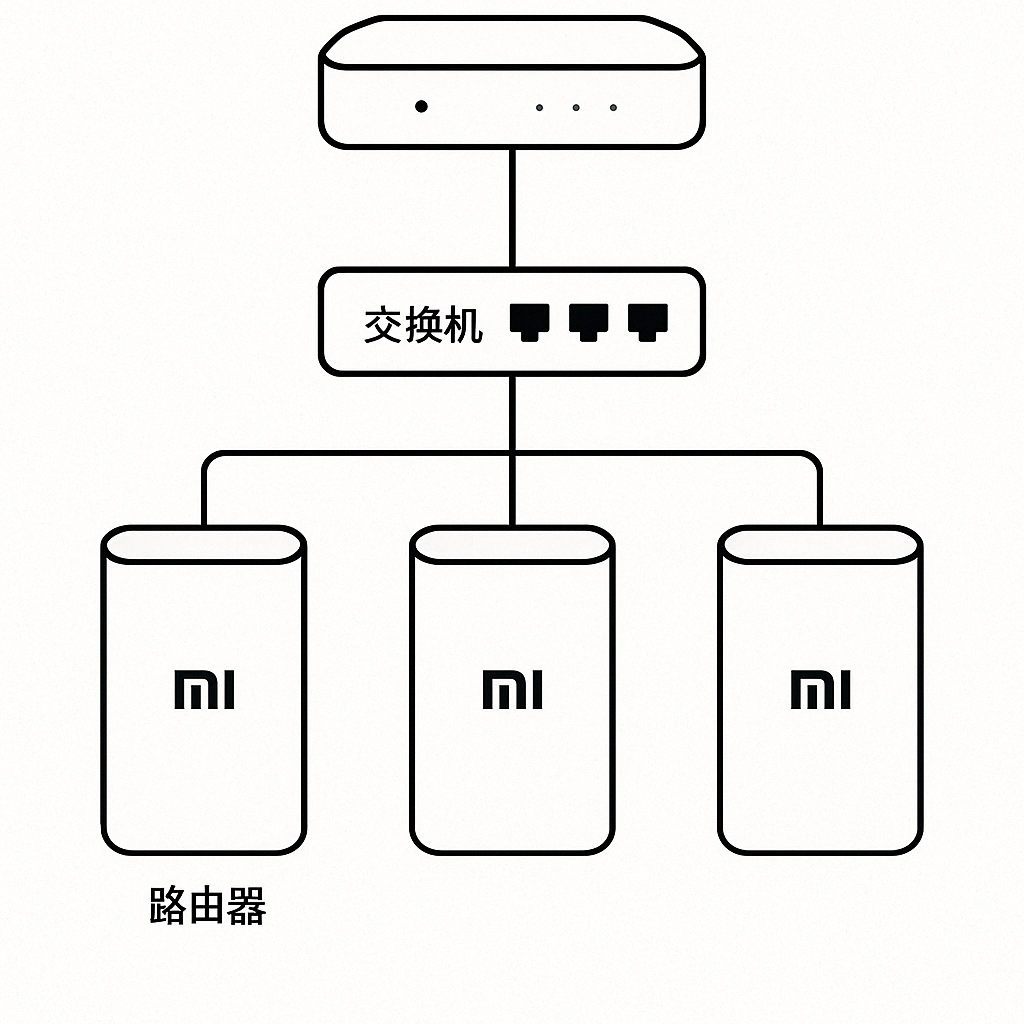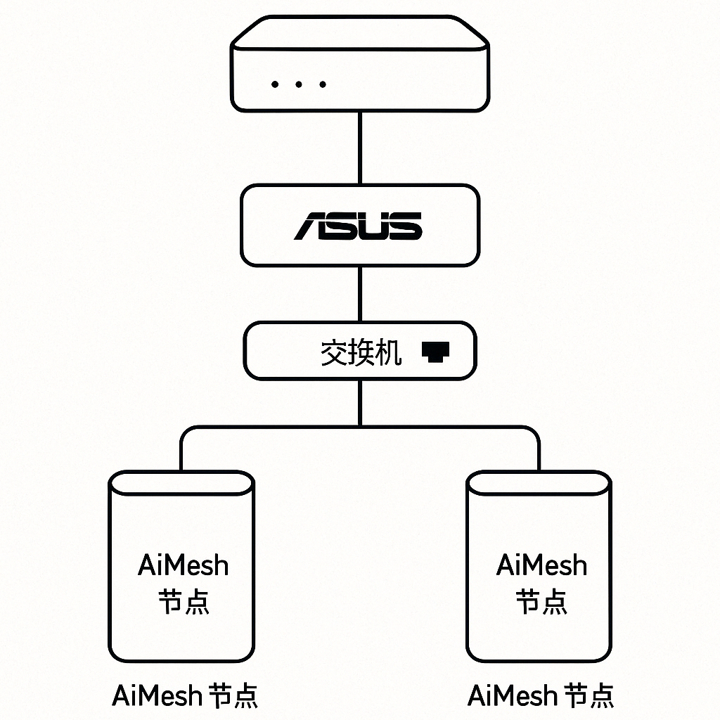 • 交换机:千兆,连接 MikroTik 与多个 AiMesh 节点和有线设备